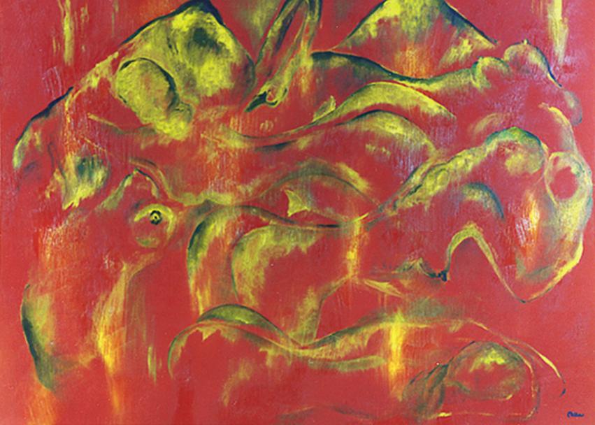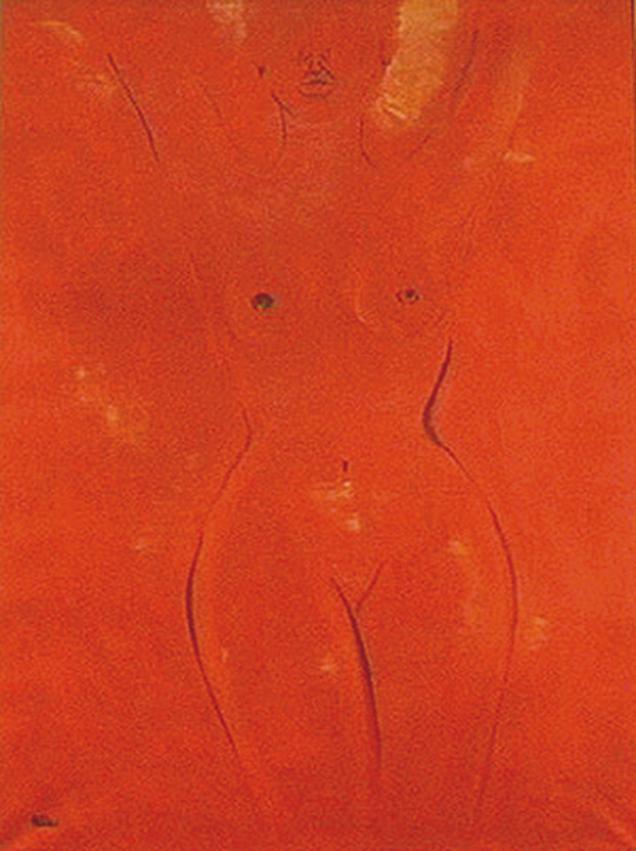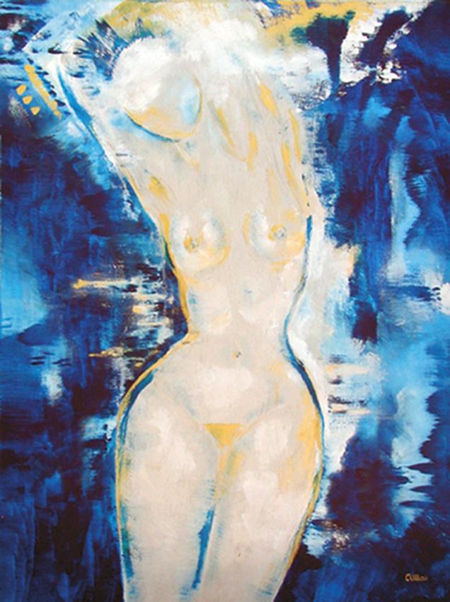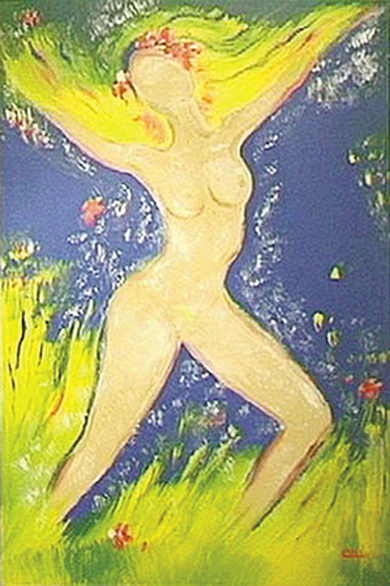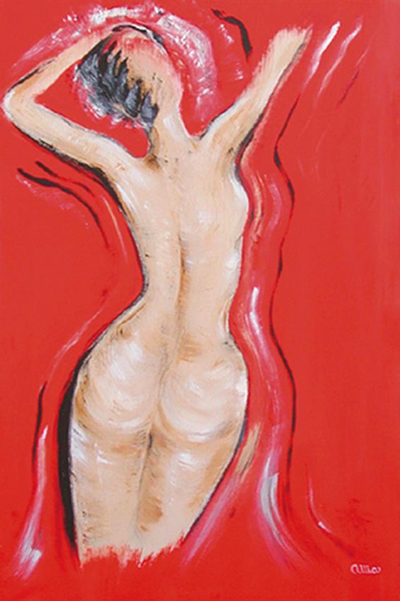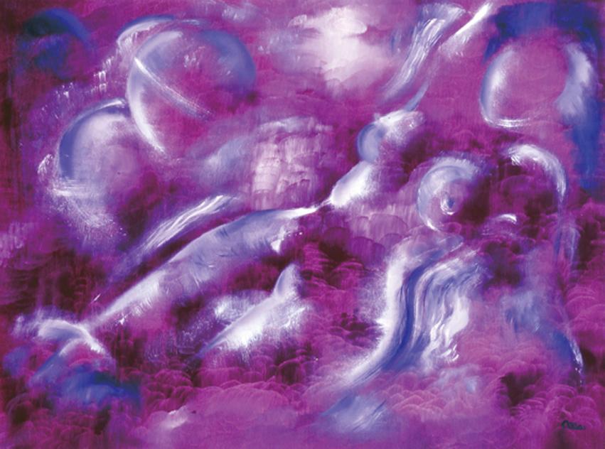 My female forms are ever colourful, abstract'ish forms, as I am drawn to and fascinated by the beauty of rounded shapes and curves, not least inspired by my years as a model. In my works I often concentrate on just one colour as a base - simple and uncluttered. My 'women of the world' as well as out of this world are, in fact, all goddesses, floating comfortably in clouds or even in space.